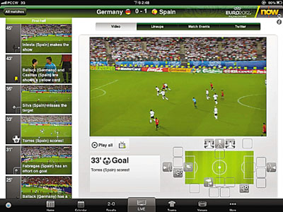 大家除了留在家中收看now TV全31場高清直播外,如果你是iPad用家,你更可以透過新推出的「歐洲國家盃官方應用程式」,緊貼整個賽事,在iPad看到賽事資訊、場地介紹外,更可看到一些平時球場的絕密畫面,包括球員到達球場、落巴士實況及各球隊在更衣室的賽前片段等,令你隨時隨地可欣賞精彩賽事。