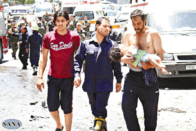 ■大馬士革近郊發生汽車炸彈襲擊,有父親抱著受傷幼女。路透社