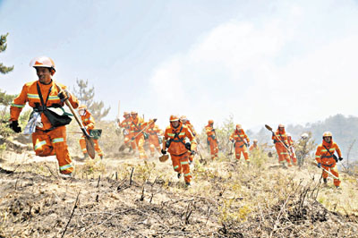 山西省晉中市榆次區、太谷縣、榆社縣三縣區交界處發生一起森林火情至12日中午尚未撲滅。圖為消防人員正在現場撲火。 ■中新社
