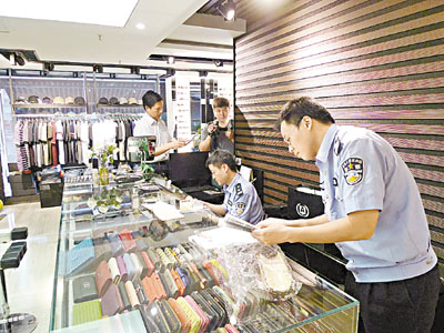 ■杭州海關緝私警察正在經營走私服裝的店舖內查緝。 香港文匯報杭州傳真