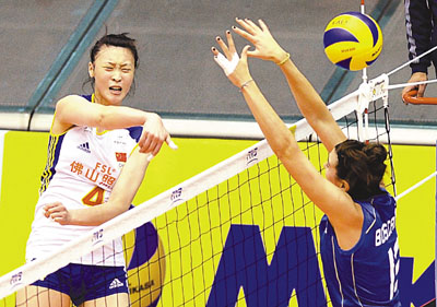 ■中國球員惠若琪(左)在比賽中扣球。 新華社