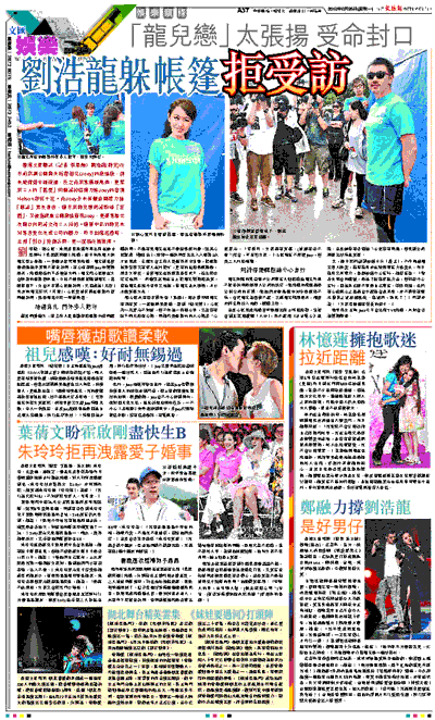 劉浩龍、劉心悠、朱薰及蔡曉慧昨早出席在迪士尼舉行「奧運歡樂跑」活動,近日的新聞人物師兄架上墨鏡,一身跑步裝束現身活動。師兄到場後便透過助手表明不接受訪問,有心避談與Joey的戀情是非,活動開始前下著傾盆大雨,師兄和心悠便在大會所設的帳篷裡休息,大抵不想傳媒接觸到師兄,幾經擾攘下,大會才安排心悠做訪問,只因成為「天后」男友的師兄突然「升呢」,心悠竟被安排在帳篷外冒雨做訪問,難怪現場引來一陣鼓噪聲。