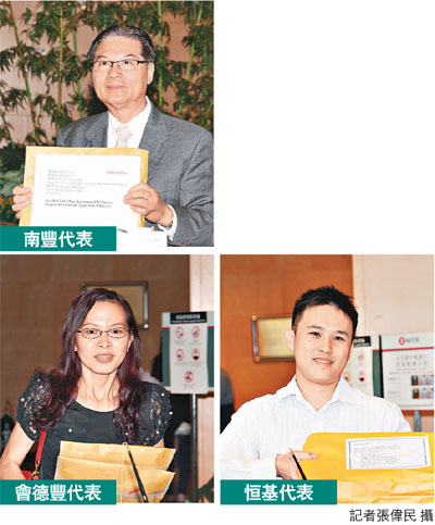 是次已知遞交意向書的發展商包括長實、新地、琣a、新世界、信和、會德豐、南豐及華懋。其中,琣a系代表表示,該集團計劃會獨資發展。而南豐發展地產部主任陳永齊表示,不擔心項目會再流標,看好項目發展遠景。
