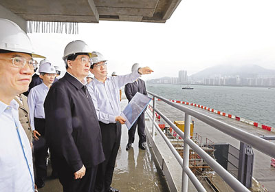 ■胡錦濤在新郵輪碼頭大樓平台眺望碼頭建設進展情況。 新華社