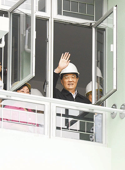 ■胡錦濤在尚未入伙的公屋裡向大家揮手致意。