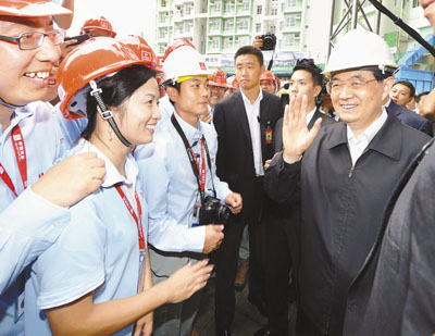 ■胡錦濤主席在公屋工地與工程建設人員親切交談。 新華社