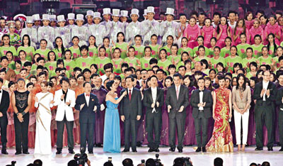 ■胡錦濤在晚會尾聲帶領全場高歌《歌唱祖國》。香港文匯報記者劉國權 攝