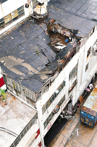 ■工廠大廈3樓平台的貨倉屋頂在暴風雨中出現大面積坍塌。