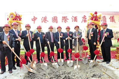 鄧祐才先生在余汝文副部長、鄭燦儒區長、王國強主席、李尚鉅書記、黃炳副主席等領導的陪同下進行酒店封頂。
