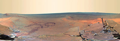 美國太空總署(NASA)火星探險車「機遇號」,早前在火星拍攝了817張高清彩色照片,再合成為歷來首張360度火星全景圖,讓地球人一睹火星地表。照片中可見自2004年1月起登陸火星的「機遇號」留下的足跡,以及火星表面的隕石坑和各種地形。 ■《每日郵報》