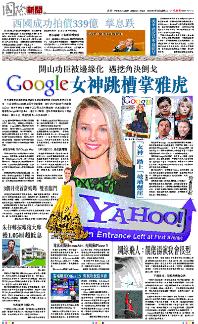 近年管理層和業績同樣問題多多的互聯網搜尋引擎巨擘雅虎前日宣布,任命勁敵Google開山美女功臣邁耶,出任5年內第5位行政總裁(CEO),原本有望坐正的臨時CEO萊文森大熱出局,消息震驚矽谷。邁耶是Google第20位員工、首位女工程師,但外界早有傳她在公司被邊緣化,難以上位,跳槽可能是一心另謀出路。
