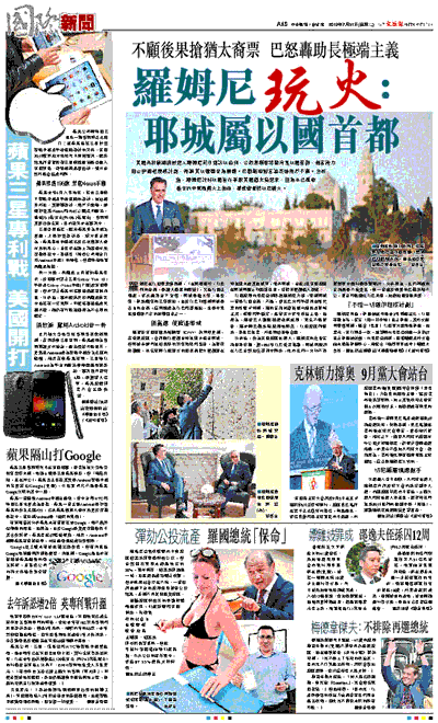 美國共和黨總統候選人羅姆尼前日到訪以色列,公然宣稱耶路撒冷是以國首都,聲言極力阻止伊朗發展核計劃,強調美以聯盟至為關鍵。巴勒斯坦對言論表達強烈不滿。分析指,羅姆尼討好以國旨在爭取美國猶太裔選票,但為本已亂象叢生的中東局勢火上加油,甚或會重燃以巴戰火。