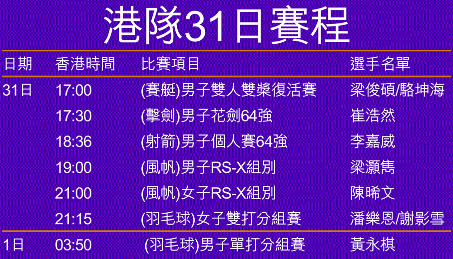 31日賽程共產生15枚金牌(以下為香港時間) (圖)