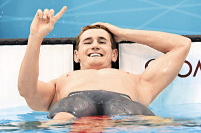 南非選手尹達保奪男子100米蛙泳冠軍,並打破世界紀錄,賽後相當招積。 ■ 法新社