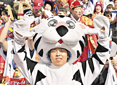 韓國支持者化身「太極虎」,到賽場撐國家隊。 ■ 美聯社