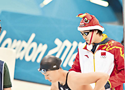 中國泳手傅園慧在100米背泳比賽前頭戴虎頭帽出場。 ■ 新華社