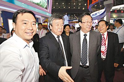 ■2011河南省承接產業和技術轉移合作交流會上,河南省委書記盧展工(左二)、省長郭庚茂(左三)在牡丹瓷展台前詢問李學武(左一)牡丹瓷的發展狀況。