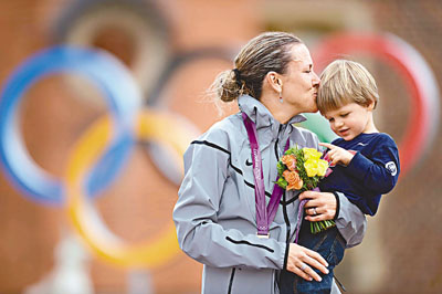 美國選手阿姆斯特朗在頒獎台上親吻兒子,她獲得女子公路單車個人計時賽金牌。 ■新華社
