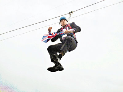 倫敦市長約翰遜昨天打算與民同樂,手拿英國國旗,今天凌空滑鋼索飛過東倫敦維多利亞公園,這個長320公尺的溜鋼索活動也對外開放。約翰遜一身利落西裝,頭戴藍色鋼盔,開心地向眾人揮手。主持人在地面上賣力大喊:「是鳥?是飛機?」不過約翰遜到了一半卻卡住,在空中盪來盪去,手還繼續揮著國旗。約翰遜回到地面後說:「他們可能忘了放開煞車裝置,不過整個體驗很有趣,我向民眾大力推薦。」