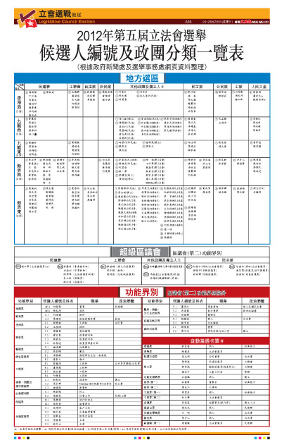 2012年第五屆立法會選舉候選人編號及政團分類一覽表 (圖)