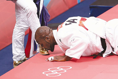 倫敦奧運3日的柔道男子100公斤以上級決賽中,法國選手里內爾奪取金牌後,親吻教練的金靴。 中新社
