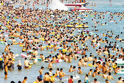 近日,避暑勝地青島全面進入旅遊旺季,各景區人滿為患。圖為遊客在青島第一海水浴場戲水納涼。 ■新華社