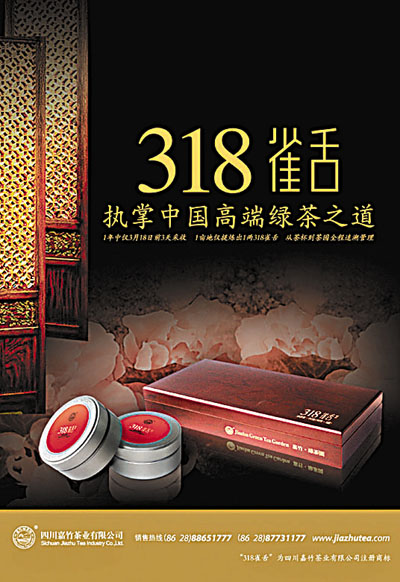 綠茶是世界上公認的六大健康飲品之最,尤以清明前的明前綠茶為貴。嘉竹公司特推的最高級別茶品「嘉竹」牌「318雀舌」,就是春茶中的「綠色極品黃金」。據了解,這種茶葉的鮮葉在一年中3月18日前3天採收,從採摘的嫩芽中精選30%作為原料,經過16道精細複雜的工藝製作,最後,1畝茶園僅能提煉出不到25克(半兩)「318雀舌」。該產品前後多次獲得國內外優茶評比大獎,並在2010年3月作為成都市政府特色禮品,贈給「2010中國綠色公司年會」參會的中外嘉賓。