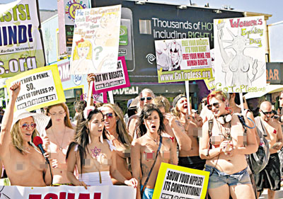 前日是美國「全國袒胸日」,一群袒胸露乳的女子高舉標語,在加州洛杉磯威尼斯海灘示威,主張婦女與男性在公共場合都有袒胸露背的相同憲法權利。 ■中新社
