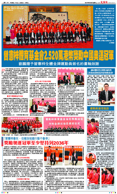原全國人大常委、金利來集團有限公司董事局主席曾憲梓以其個人名字設立的體育基金會,23日在北京人民大會堂為2012年倫敦奧運會上奪金的運動員頒發2,520萬港幣(約合人民幣2,064餘萬元)獎金,以示獎勵。曾憲梓及其子、基金會理事長曾智明等,為運動員代表林丹、孫楊頒發獎金支票,奧運跆拳道衛冕冠軍吳靜鈺代表運動員致謝。國家體育總局局長、中國奧委會主席劉鵬則向曾憲梓贈送了有全體金牌運動員簽名的畫軸。 ■香港文匯報記者/攝影 趙一存 北京報道