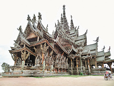 到泰國,相信不少遊人都會到曼谷朝拜四面佛,今次筆者帶大家走到位於芭堤雅Rachaveto海角的一座出於宗教理念而蓋的藝術建築「真諦聖域」(The Sanctuary of Truth),但這座雖說是真理寺,卻不是廟,反而可說成是一座城堡,其最大特色是除了地基外,包括建築與雕刻,無論大小細節全部使用柚木建成,並沒有用過一根釘子,全是以木頭拼湊而成。