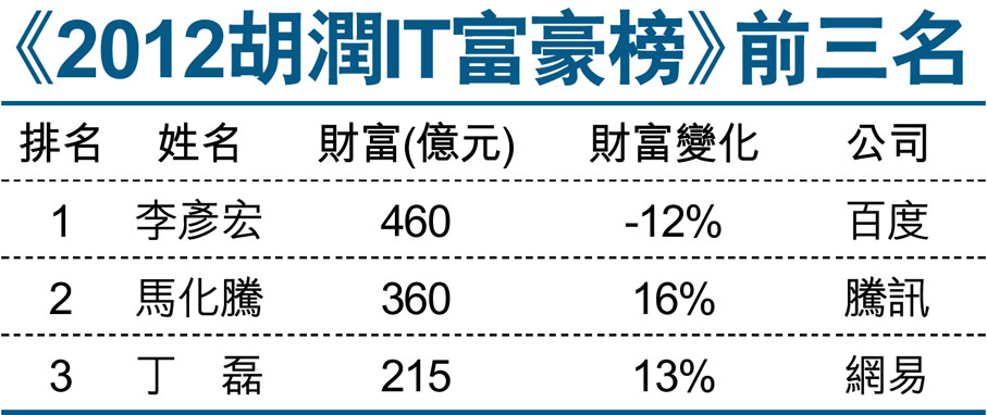 胡潤IT富豪榜 李彥宏馬化騰丁磊列三甲 (圖)