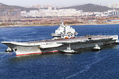 中國航母「遼寧艦」昨日停靠在遼寧省大連港碼頭,完成了其正式交接入役後的首次出海。圖為「遼寧艦」在拖船的簇擁下駛向大連港碼頭。 ■中新社