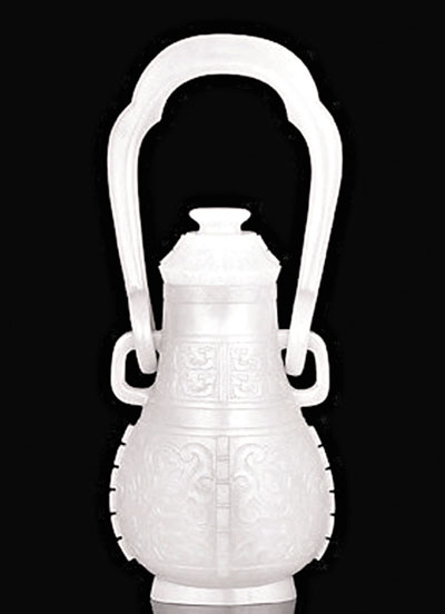 ■清乾隆青玉雕仿古獸面紋提梁卣。