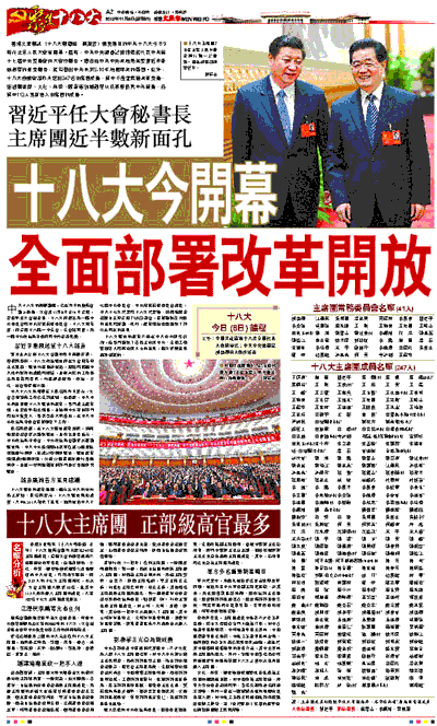 中共十八大的具體議程,已在昨日的預備會議上通過。大會於11月8日至14日召開,習近平任大會秘書長。十八大將選出新一屆中央委員會和中央紀律檢查委員會。十八大閉幕後,將召開十八屆一中全會,全會結束後,新一屆中央政治局常委將同中外記者見面。