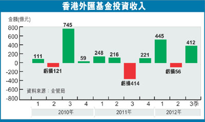 香港文匯報訊 (記者 馬子豪) 港股第三季累升7.2%扭轉上半年頹勢,外匯基金亦受惠股、匯、債三線賺錢之下,由第二季經修訂的蝕56億元,轉盈大賺412億元;首三季計,外匯基金累賺801億元,同比增13.3倍。但展望第四季,金管局總裁陳德霖表示,環球經濟陰霾仍多,計有美國財政懸崖問題,久未解決的歐債危機,加上地緣政局又不穩,難以預測第四季外匯基金表現。銀行界人士亦預期,在不穩因素眾多下,第四季宜以持平為目標。