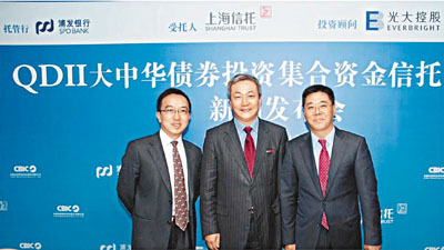 香港文匯報訊(記者 卓建安)光大控股(0165)昨日宣佈,由該公司旗下中國光大資產管理擔任投資顧問的QDII大中華債券投資集合資金信託計劃宣告成立,募集規模達10億元人民幣。據公佈,該信託計劃為內地第一個QDII集合資金信託產品,主要投資於境外交易的中國企業債券。據公佈,QDII大中華債券投資集合資金信託計劃的受託人為上海國際信託公司,中債信用增進投資公司和上海浦東發展銀行分別擔任本金擔保機構和境內託管銀行。光大控股執行董事兼首席執行官陳爽(圖右一)表示,QDII大中華債券信託計劃的成功發行,可以幫助內地投資者進行全球化的資產均衡配置,加快促進人民幣國際化的進程。