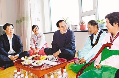 ■孫政才(中)看望延吉市棚戶區改造項目錦繡天景小區回遷居民。資料圖片