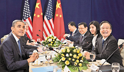 奧巴馬說:「中美合作對亞太地區乃至世界安全和繁榮至關重要,中美作為世界兩大經濟體,對促進亞洲和全球經濟平衡、可持續增長負有特殊責任,發揮著重要的引領作用。中美兩國領導人就共同面臨的全球和地區問題保持接觸和溝通十分重要。美方希望繼續加強兩國關係。」