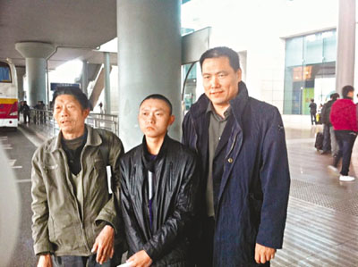 ■昨早11時許,任建宇(中)與代理律師浦志強(右)趕到重慶機場。資料圖片