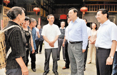 ■張德江在重慶少數民族聚集區調研,親切關心民眾生活。 香港文匯報 重慶傳真