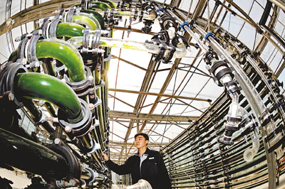 ■河北廊坊新奧集團煤基能源生產零排放技術系統實驗中心微藻養殖暖房,工人在檢測微藻養殖光照強度。 新華社