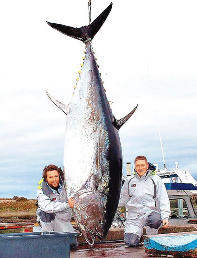■加拿大漁民托爾斯及庫克日前出海,於新斯科舍省坎索海岸捕獲一條重達1,000磅的藍鰭吞拿魚。他們計劃將巨魚售予日本,預計賣得2萬英鎊(約24.8萬港元),可製成2萬件吞拿魚壽司。庫克稱,這條吞拿魚體形異常龐大,無法把牠綁在船上。托爾斯最終利用繩子綁緊魚尾,耗用2小時才能把牠拖回岸。 ■《每日郵報》