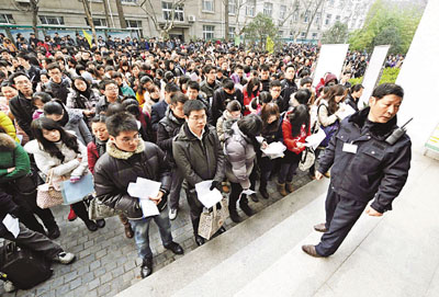 2013年度國家公務員考試(簡稱「國考」)一年一度的「千軍萬馬搶過獨木橋」大戰11月24日再次打響。被譽為內地「鐵飯碗」的公務員成功衛冕百萬人心中最理想職業。超過150萬人趕考,比2012年度增加20萬人,最火爆職位更是「萬裡挑一」,其中國家統計局地方科員職位位列「十大熱門職位」前兩位,報名人數超過9,000人,但海監部門職位亦爆出無人報考的「冷門」……今年的「國考」招錄共有140多個中央機關及附屬機構參加,計劃招錄20,339人,比去年增加約2,000人,招錄規模再創新高。 ■節自《 內地「國考」萬裡挑一》,香港《文匯報》,2012-11-25
