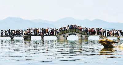 ■杭州西湖涌金橋上人頭攢動。 資料圖片
