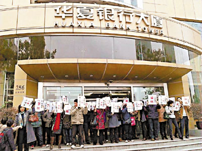 ■華夏銀行上海嘉定支行有員工私賣投資產品,有受害客戶日前在該行門外維權。小圖為他們打出的標語。 網上圖片