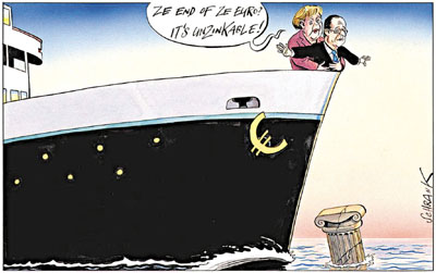 ■圖為英國《獨立報》的漫畫,將「默朗德」化為《鐵達尼號》主角,女方從後擁抱男方,海面則有一條半沉的古希臘石柱。資料圖片