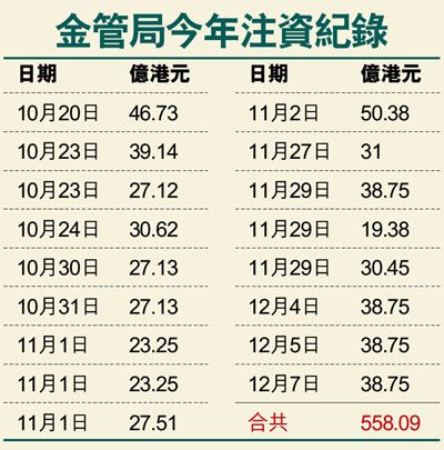 是次為金管局自10月20日以來第17度入市,累積向市場注入約558.09億元;而單計11月尾至本月初期間,注資金額則達235.83億元。交易員指出,本周港元兌美元幾乎未偏離過7.75的強方兌換保證,昨日叫價曾見7.7497港元。交易員認為,資金於年底前仍會持續流入,料金管局短期內仍需繼續入市。