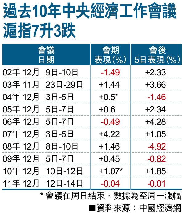 過去10年中央經濟工作會議滬指7升3跌 (圖)