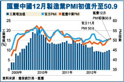 香港文匯報訊(記者 房廈 北京報道)擢袘行昨日公佈,12月擢袘s造業採購經理人指數(PMI)預覽值衝至50.9,創下14個月來最高水準,表明製造業活動在進一步擴張,經濟回暖態勢趨強。其中,新訂單指數更達到19個月來的高點至52.7。對此,擢蚺j中華區首席經濟學家屈宏斌表示,這顯示在內需的拉動下,中國經濟復甦動力持續增強。不過他亦提醒,由於11月出口增速遜於預期,說明外部風險仍然存在,中國政府應保持適度的寬鬆政策。