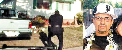 美國加州一名警員去年6月涉嫌槍殺手無寸鐵的被通緝積犯,死者準備投降之際,被警員在4.2秒內連開13槍,中了11槍慘死(左圖)。涉案警員被裁定無罪,現已復職。死者家屬和律師周三召開記者會,公開在facebook發布的現場警車拍攝片段,要求司法部門重新調查及控告警員謀殺。